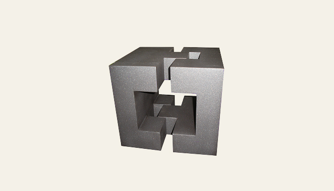 Tiempo sin silencio, de la escultora Pilar Sáenz, es una pieza de geometría contundente y silenciosa, realizada en hierro forjado con acabado gris. Su estructura, compuesta por volúmenes que se entrelazan y se abren hacia el vacío, invita a reflexionar sobre el paso del tiempo y la quietud interior. La solidez del material contrasta con la ligereza visual de sus formas, creando una obra de presencia serena y equilibrio perfecto entre fuerza y silencio.